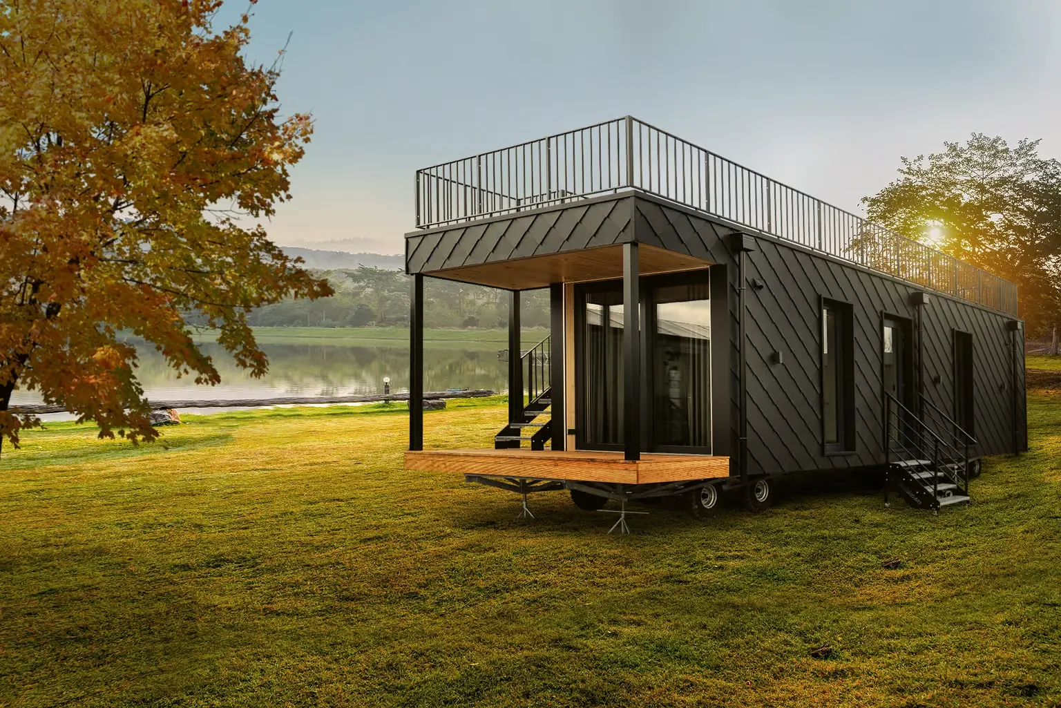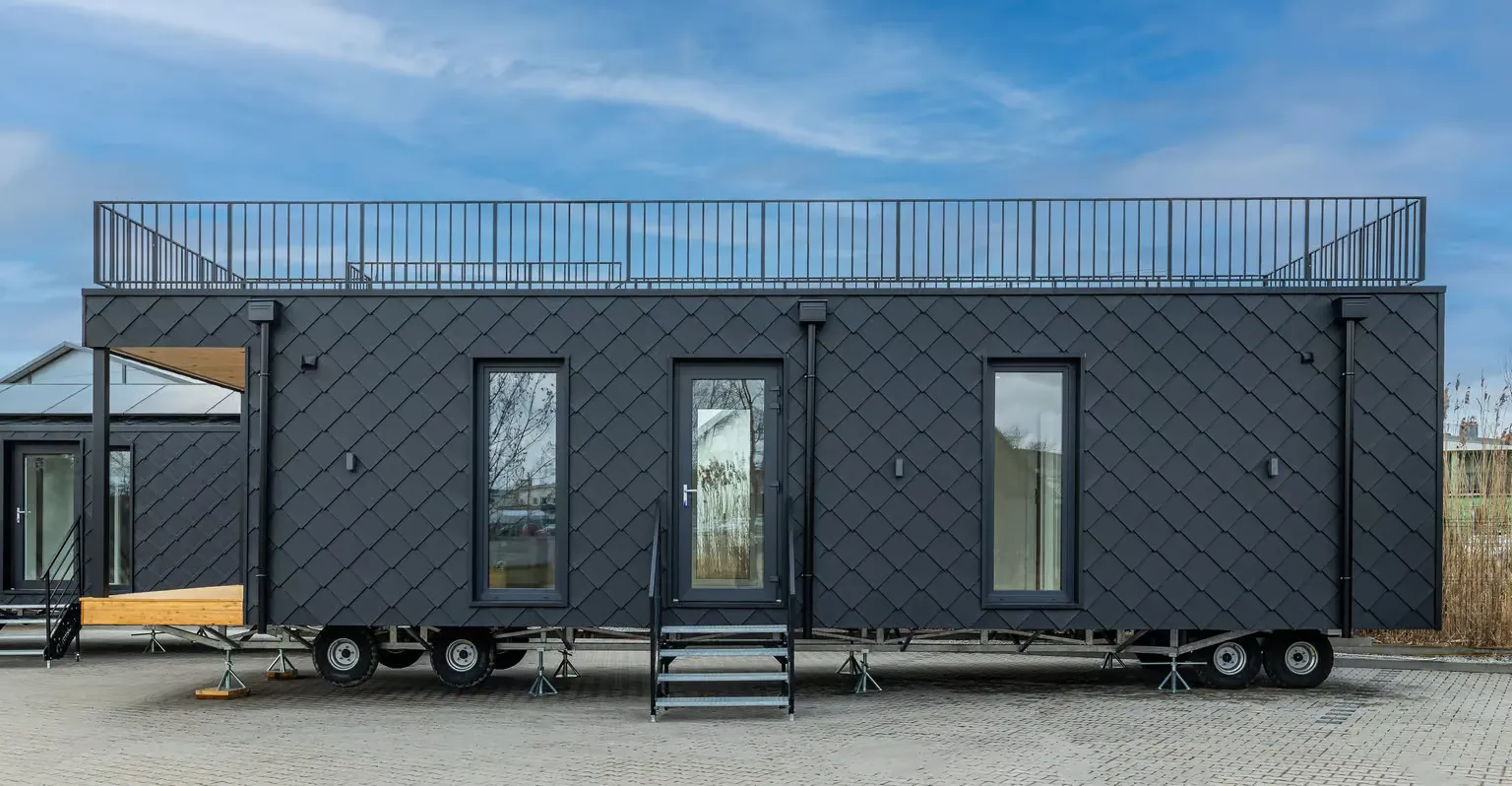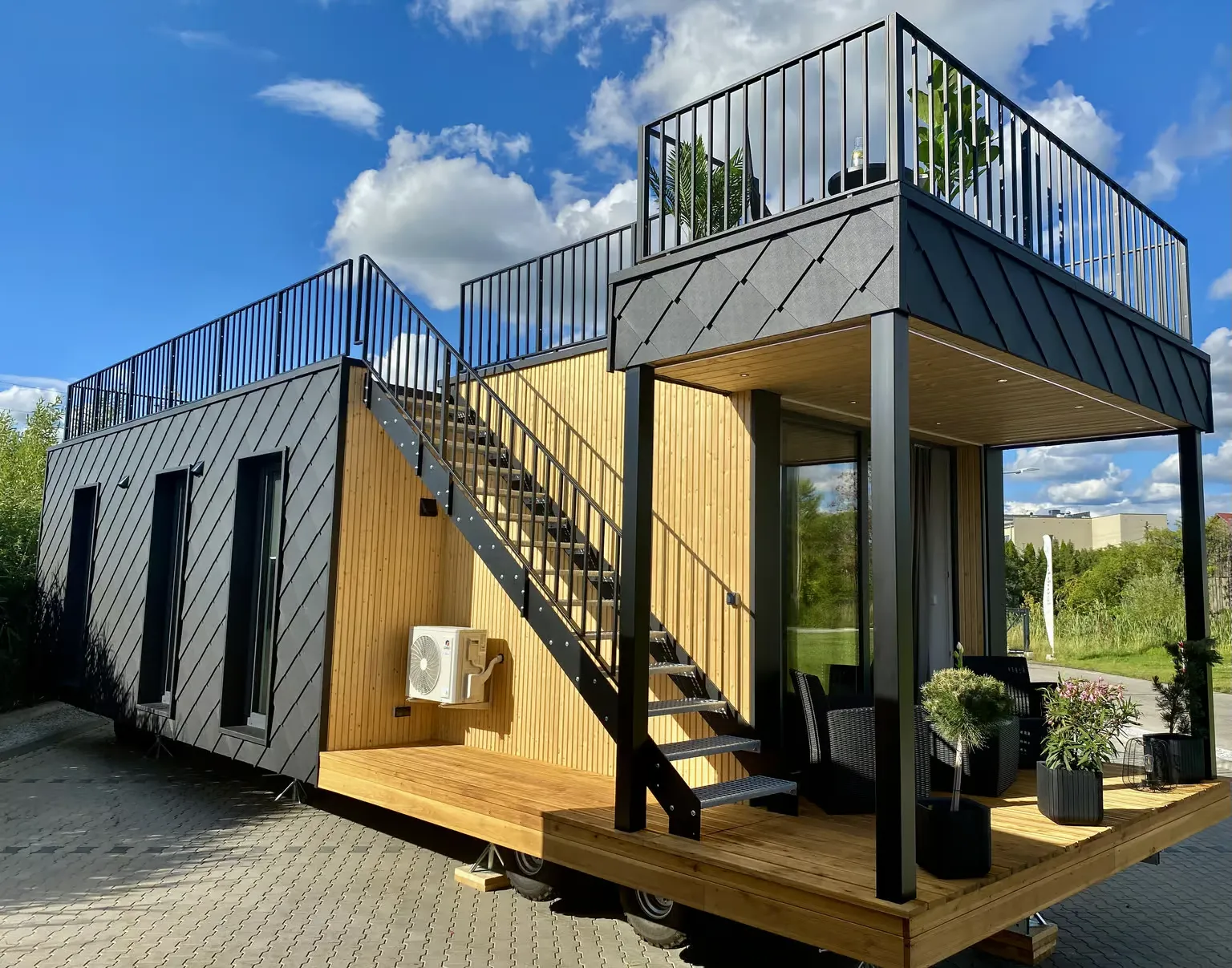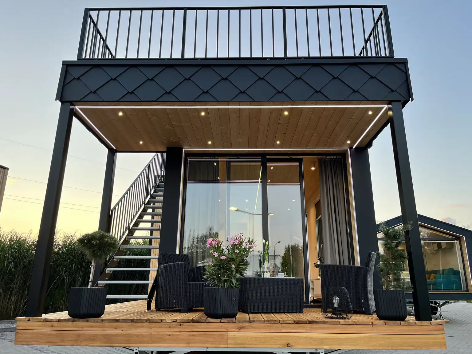 Pequeña casa de gama alta para vivienda permanente con 57,2 m², dos dormitorios y azotea. Gracias a la inteligente distribución de las habitaciones, se ha podido crear una pequeña terraza con una escalera exterior contigua como acceso a la gran azotea. En el interior, Golden Sky impresiona por su diseño moderno y su mobiliario hecho a medida.