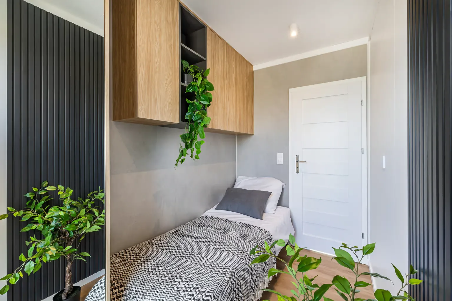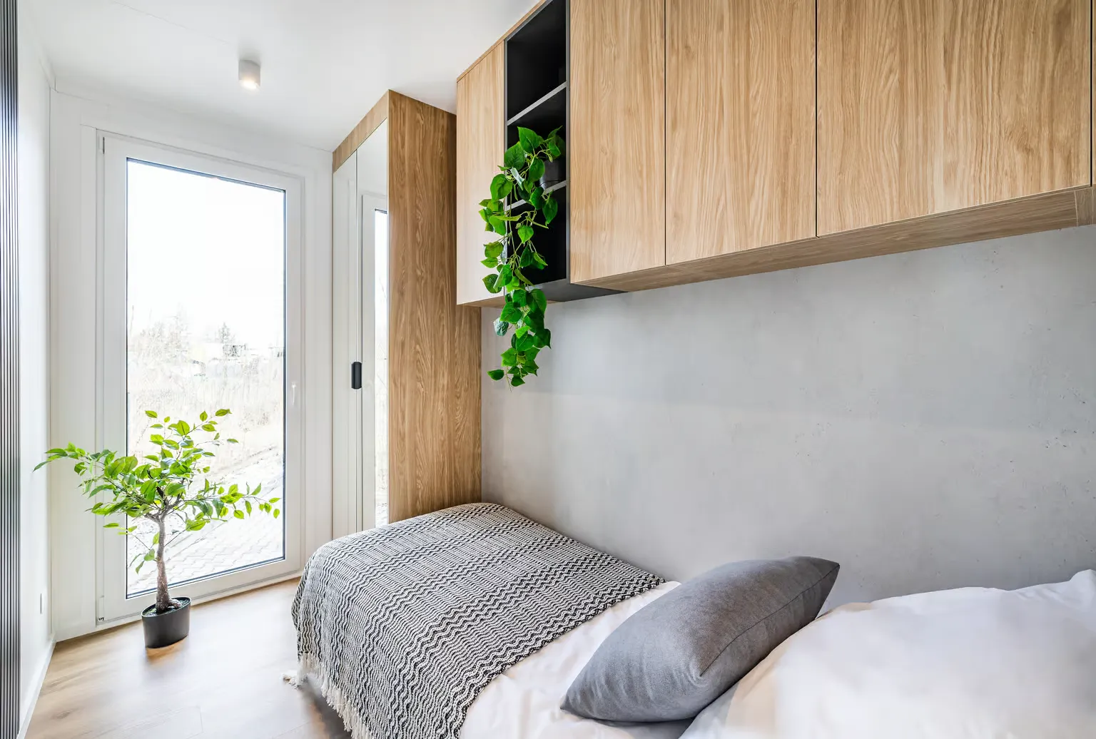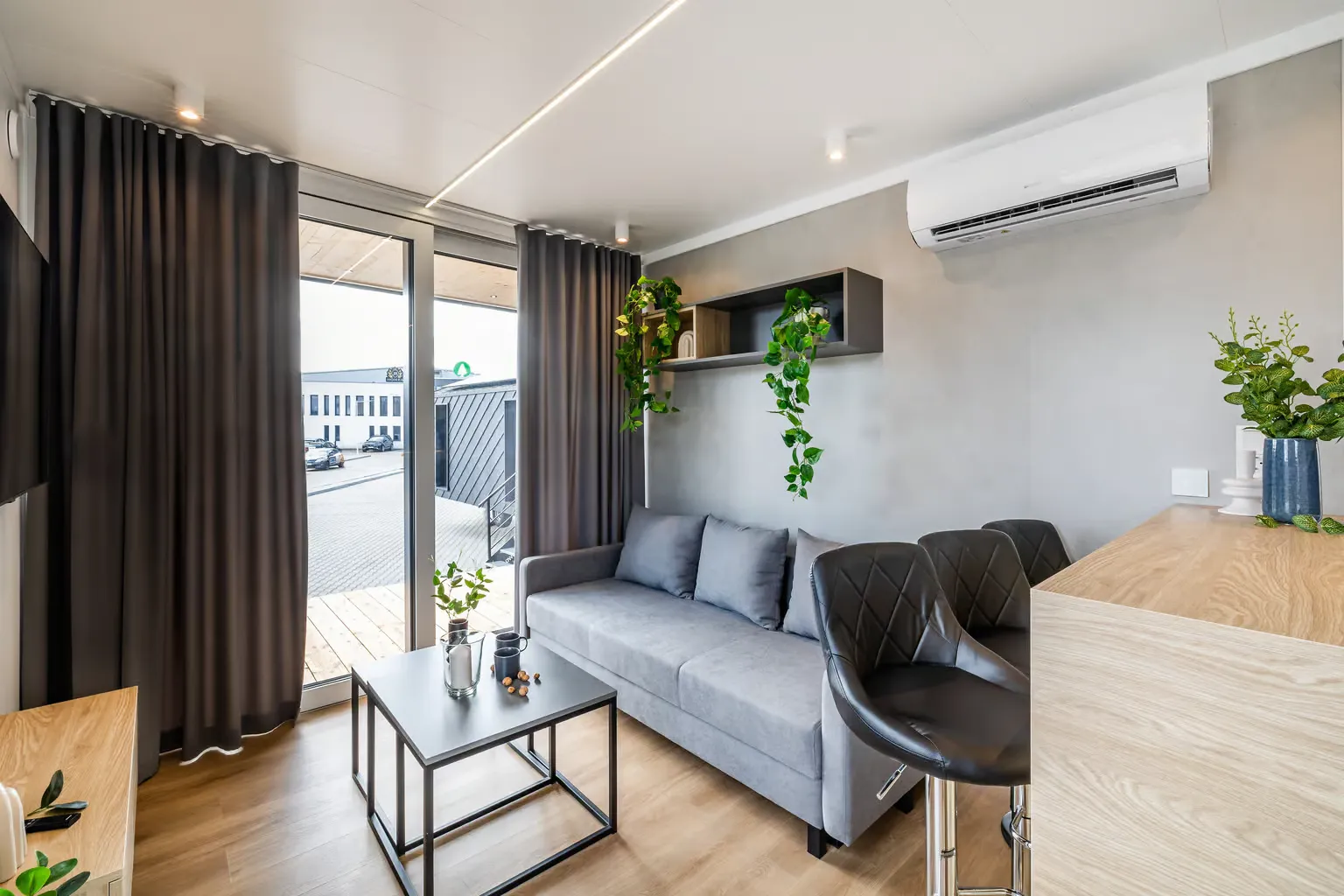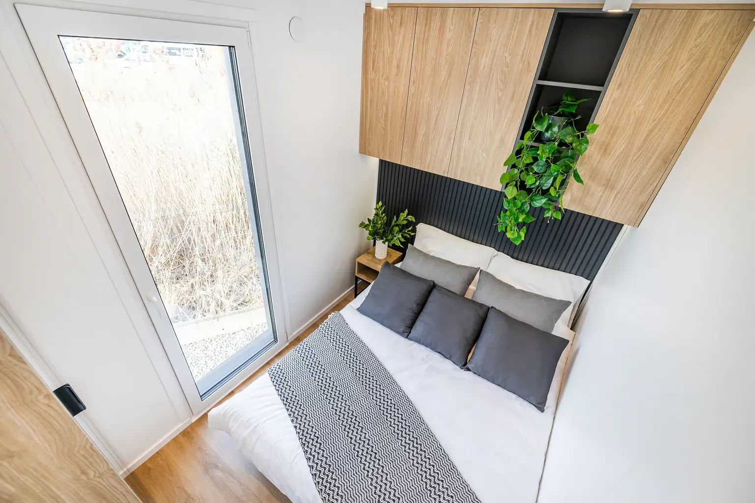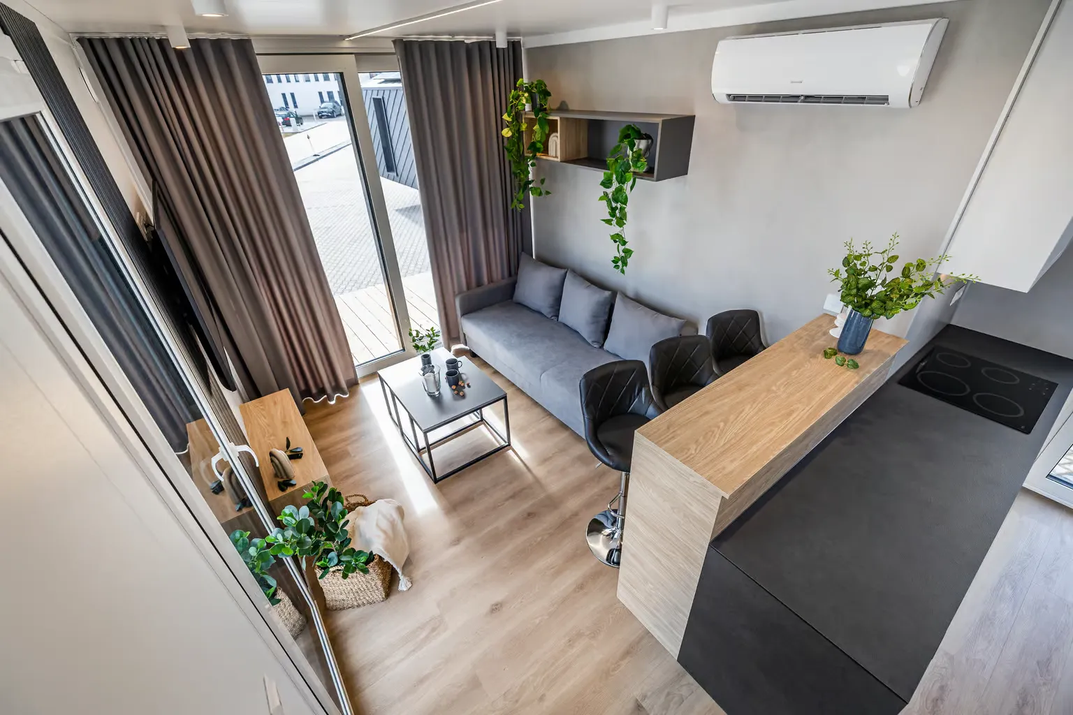 Pequeña casa de gama alta para vivienda permanente con 57,2 m², dos dormitorios y azotea. Gracias a la inteligente distribución de las habitaciones, se ha podido crear una pequeña terraza con una escalera exterior contigua como acceso a la gran azotea. En el interior, Golden Sky impresiona por su diseño moderno y su mobiliario hecho a medida.