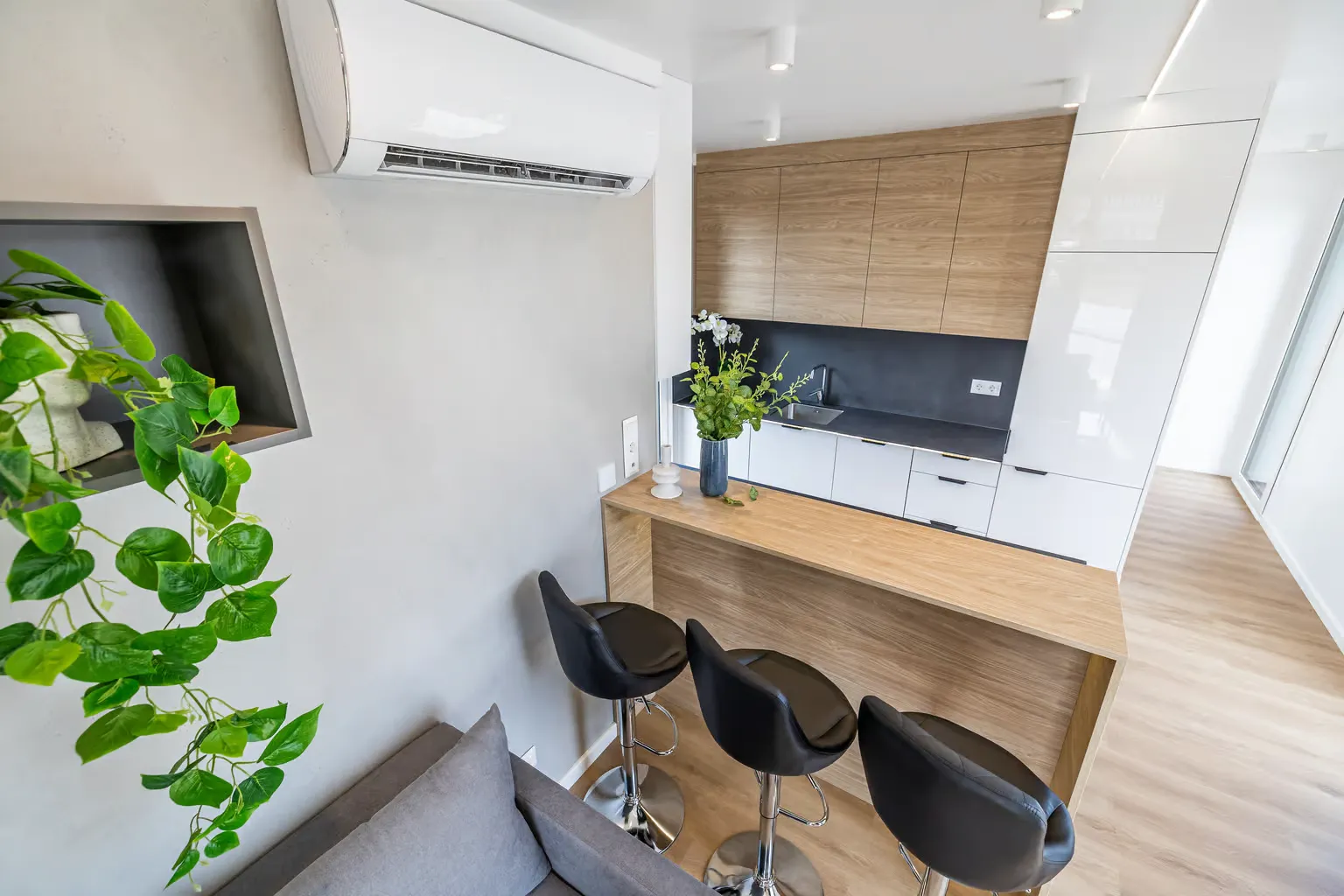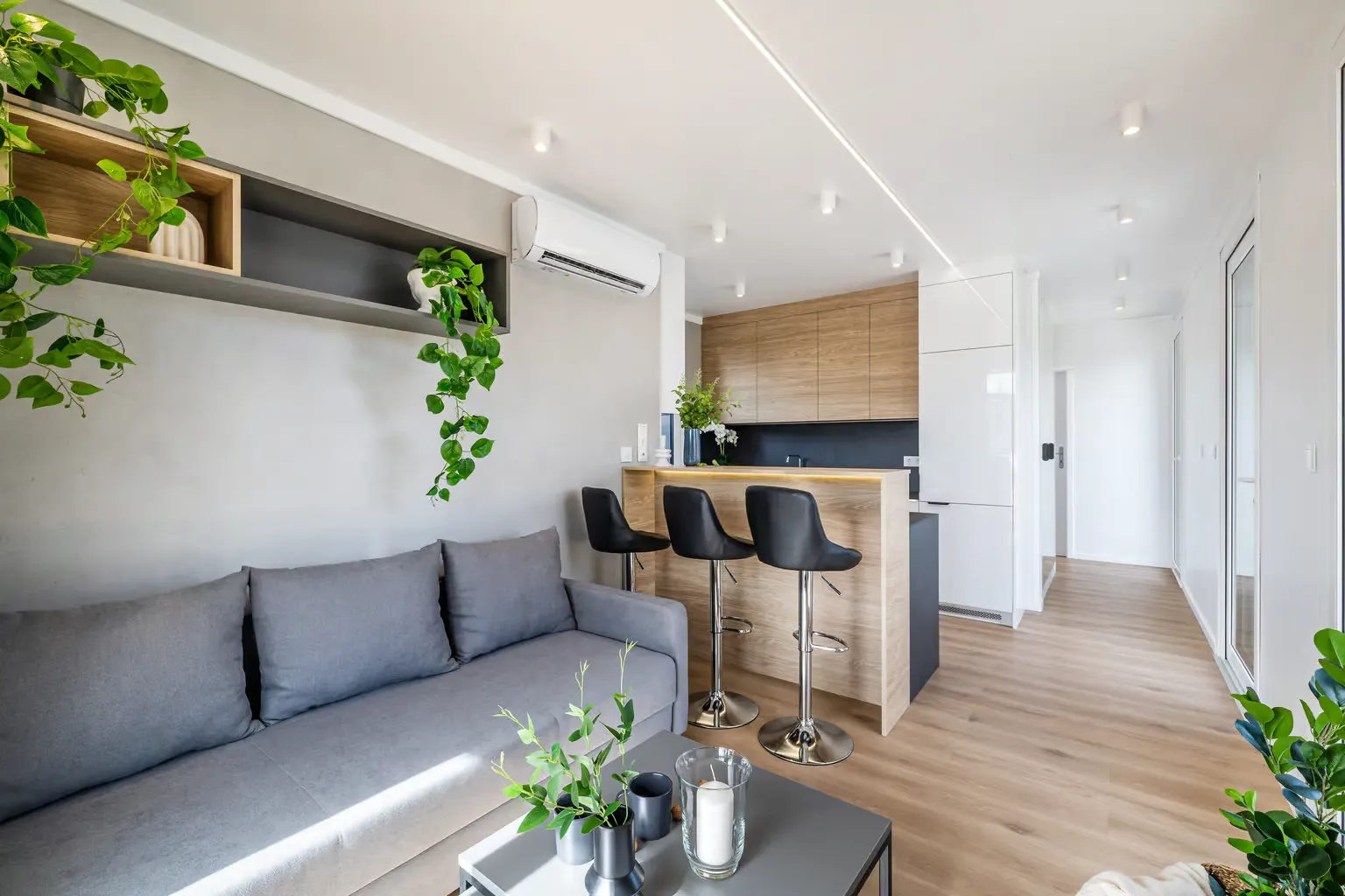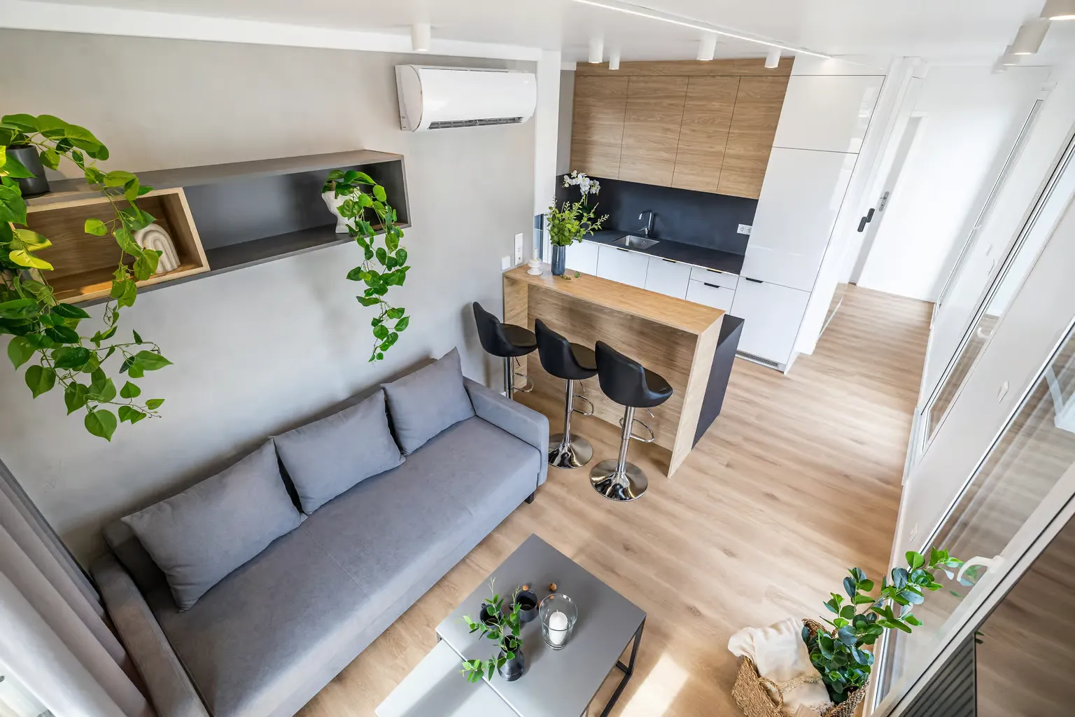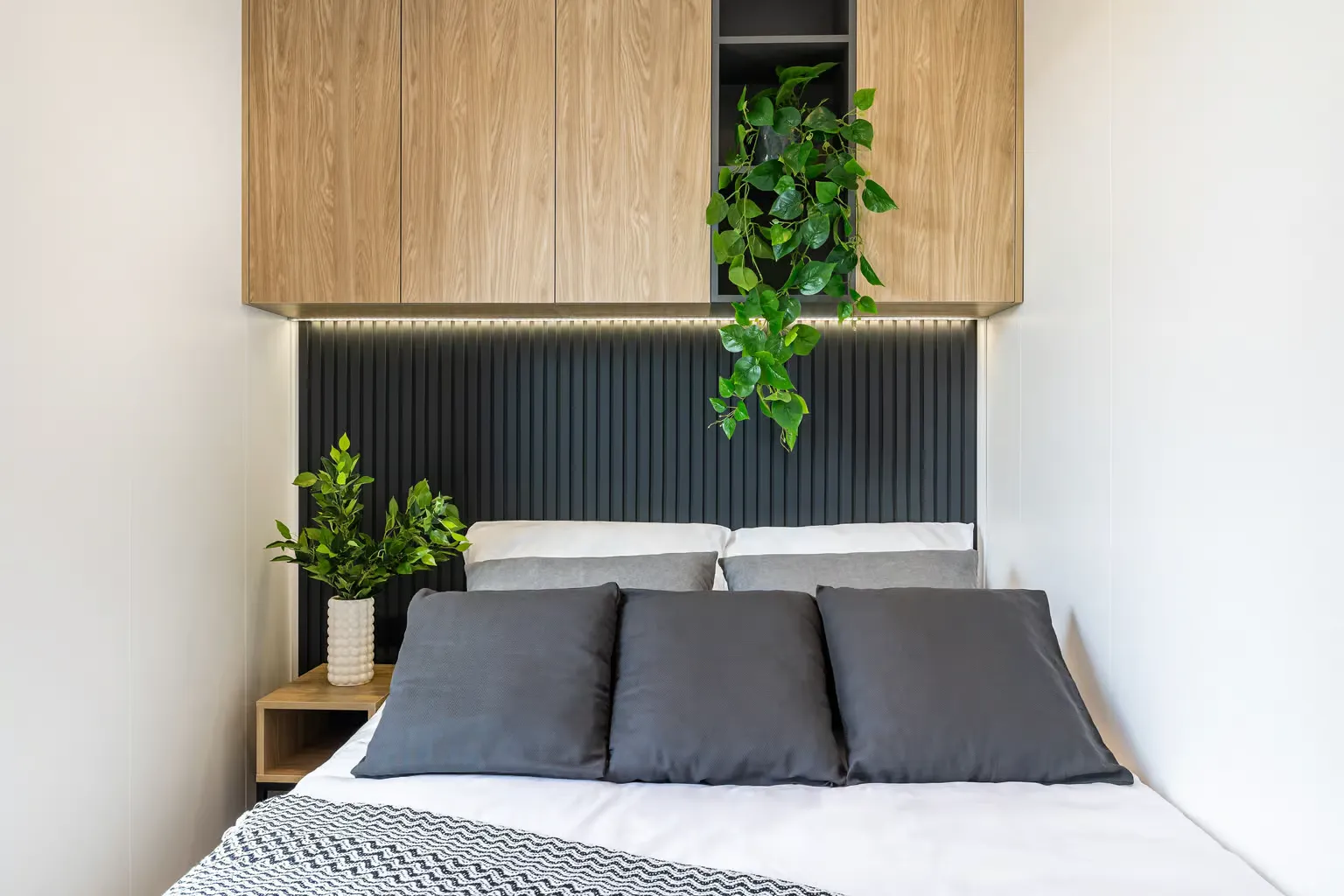 Pequeña casa de gama alta para vivienda permanente con 57,2 m², dos dormitorios y azotea. Gracias a la inteligente distribución de las habitaciones, se ha podido crear una pequeña terraza con una escalera exterior contigua como acceso a la gran azotea. En el interior, Golden Sky impresiona por su diseño moderno y su mobiliario hecho a medida.