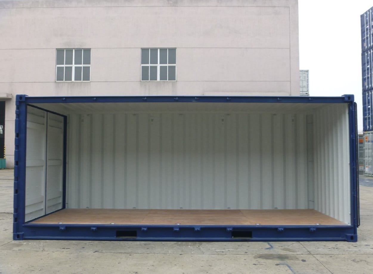 El contenedor marítimo Open Side de 20 pies puede abrirse hacia fuera en los extremos, pero sobre todo a lo largo, ya que tiene una apertura lateral completa sin montante central.