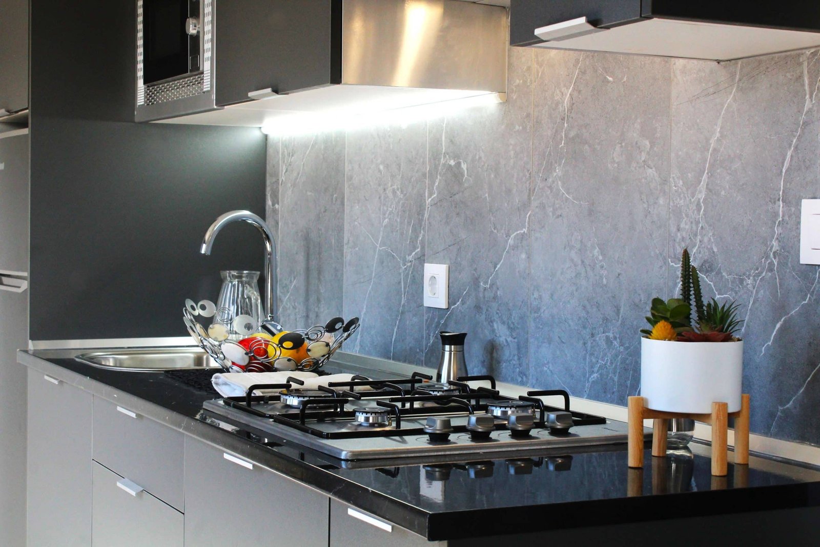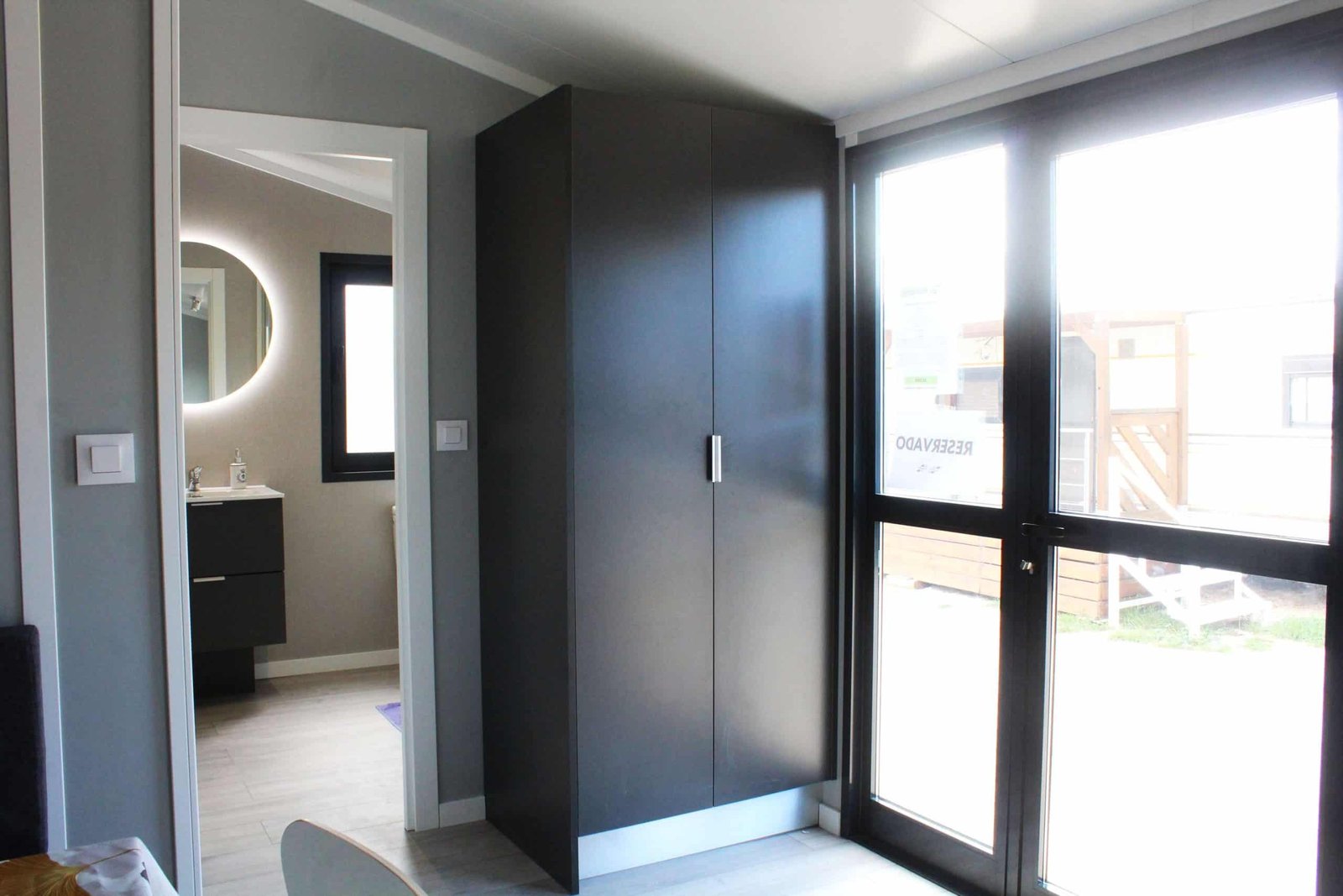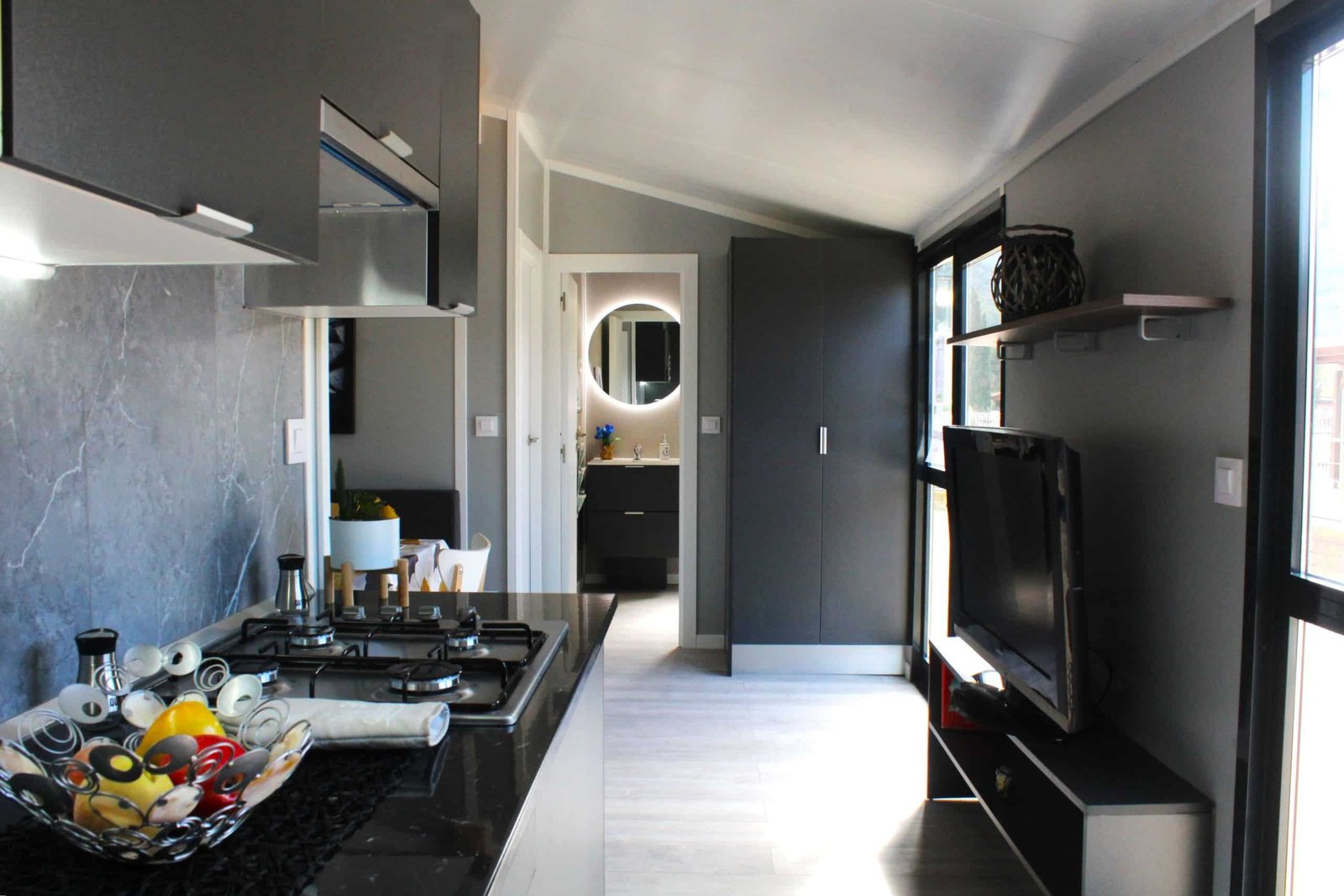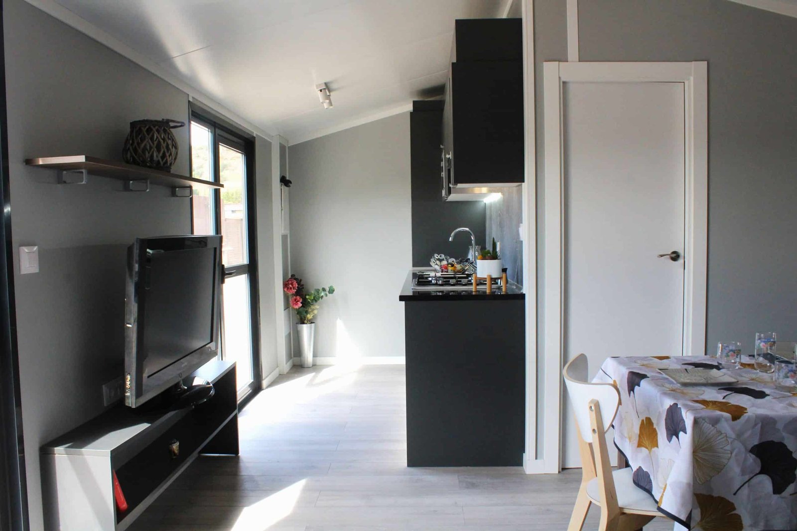 La casa móvil dispone de un amplio y luminoso salón-comedor por su puertas, ventanas y luces de serie. Está equipada con una mesa, dos sillas, sofá en forma de L con espacio en el inferior par aguardar objetos y pertenencias, mueble para T.V., un armario garnde y una estantería. La cocina es abierta y completa con azulejo porcelánico, equipada con microondas, extractor, vgofones a gas, nevera, fregadero, varios armarios y estanterías.