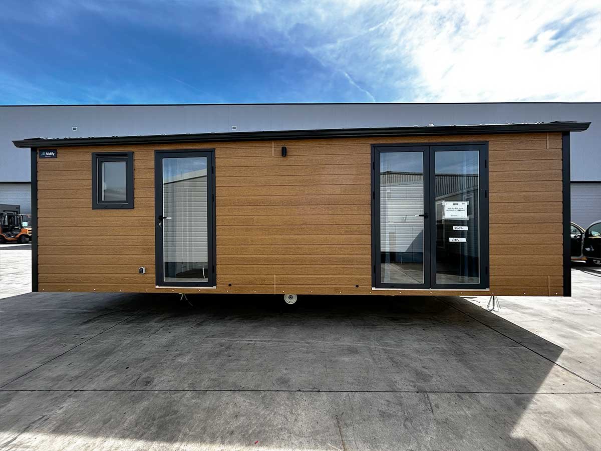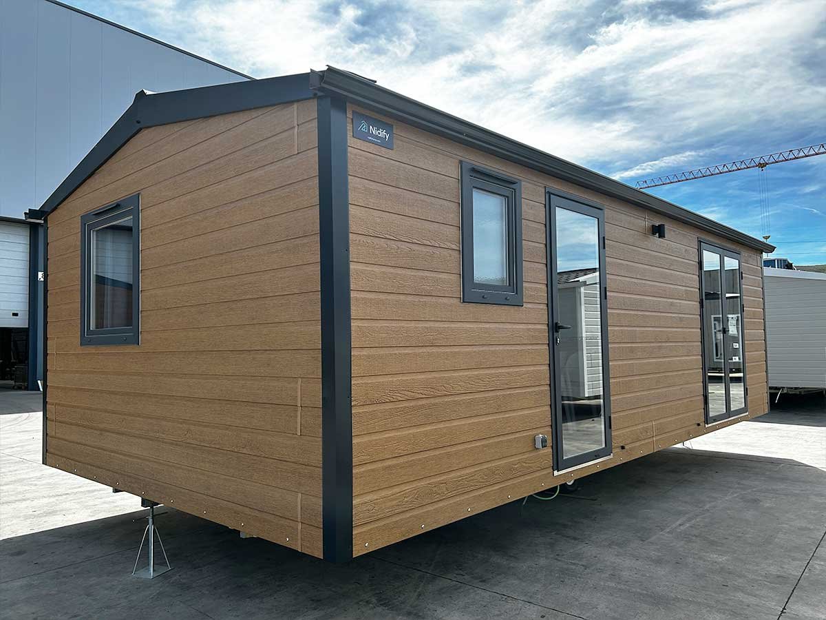 Mobil home en exposicón modelo Nidify Serie E Bora Bora 7,66m. Acabado exterior Canexel Yellowstone y carpintería exterior de PVC tipo climalit antracita. Acabado interior colección azul.