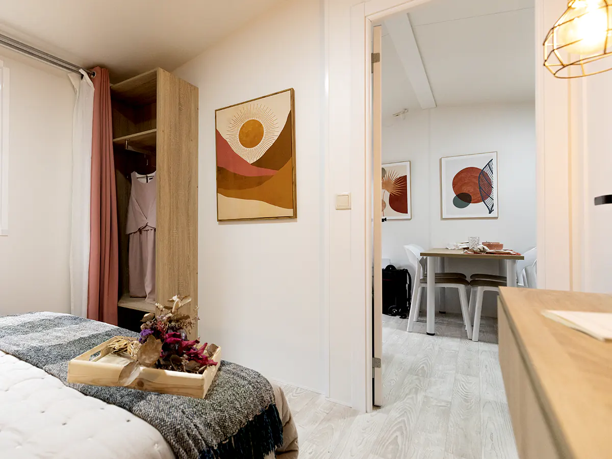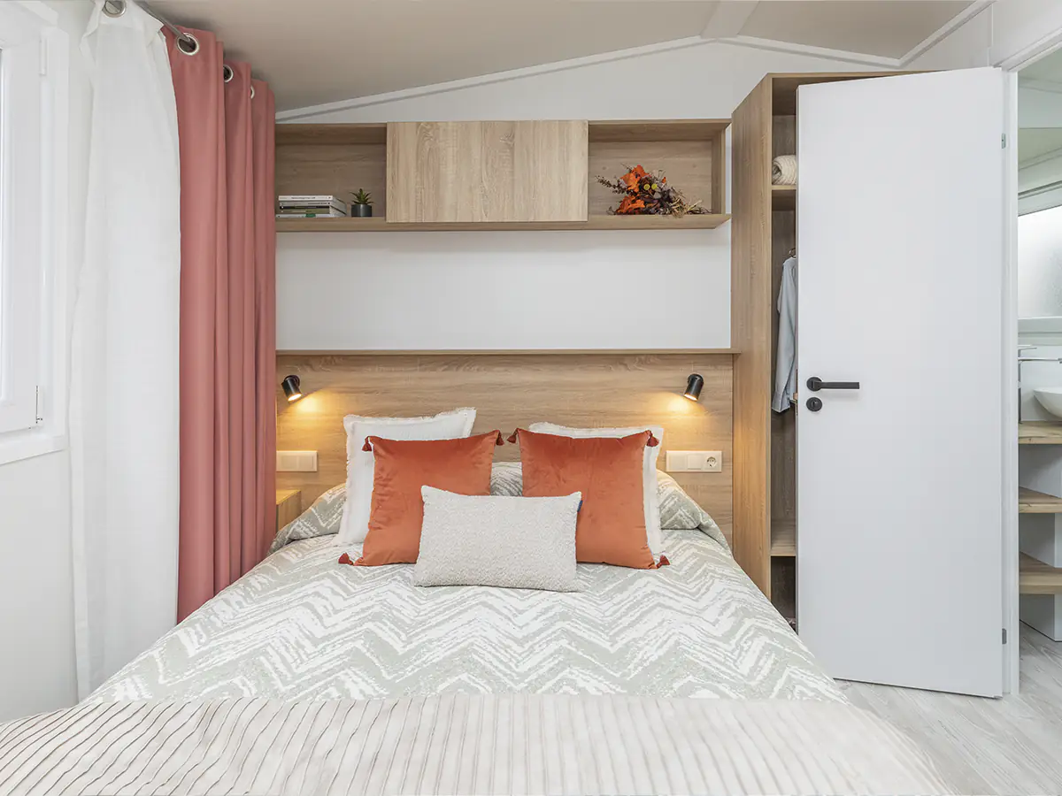 Mobil home nuevo en exposición de la Serie E de NIDIFY. Acabado exterior en Vinilo Natural.
