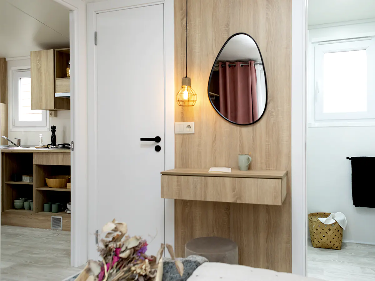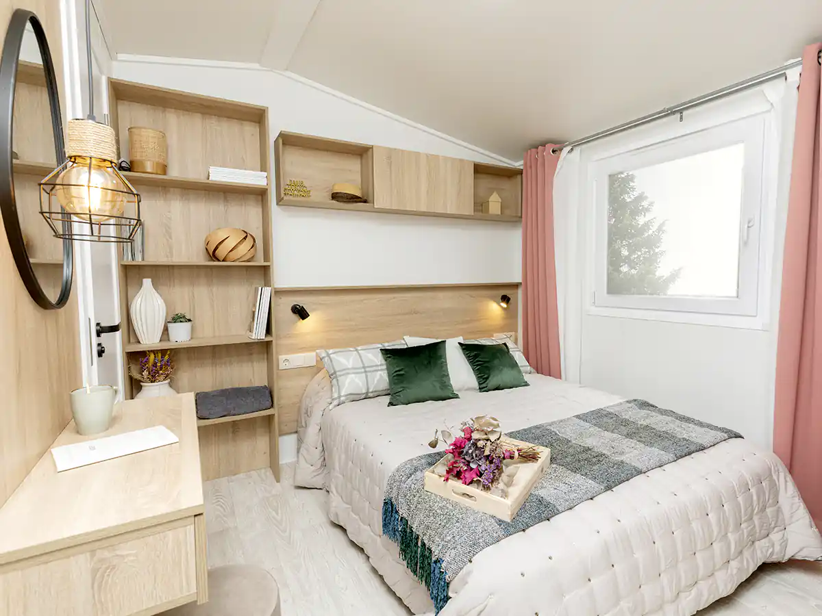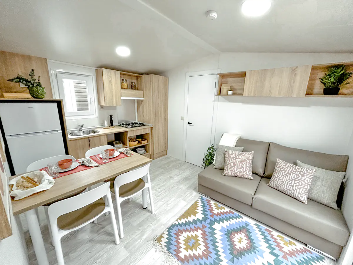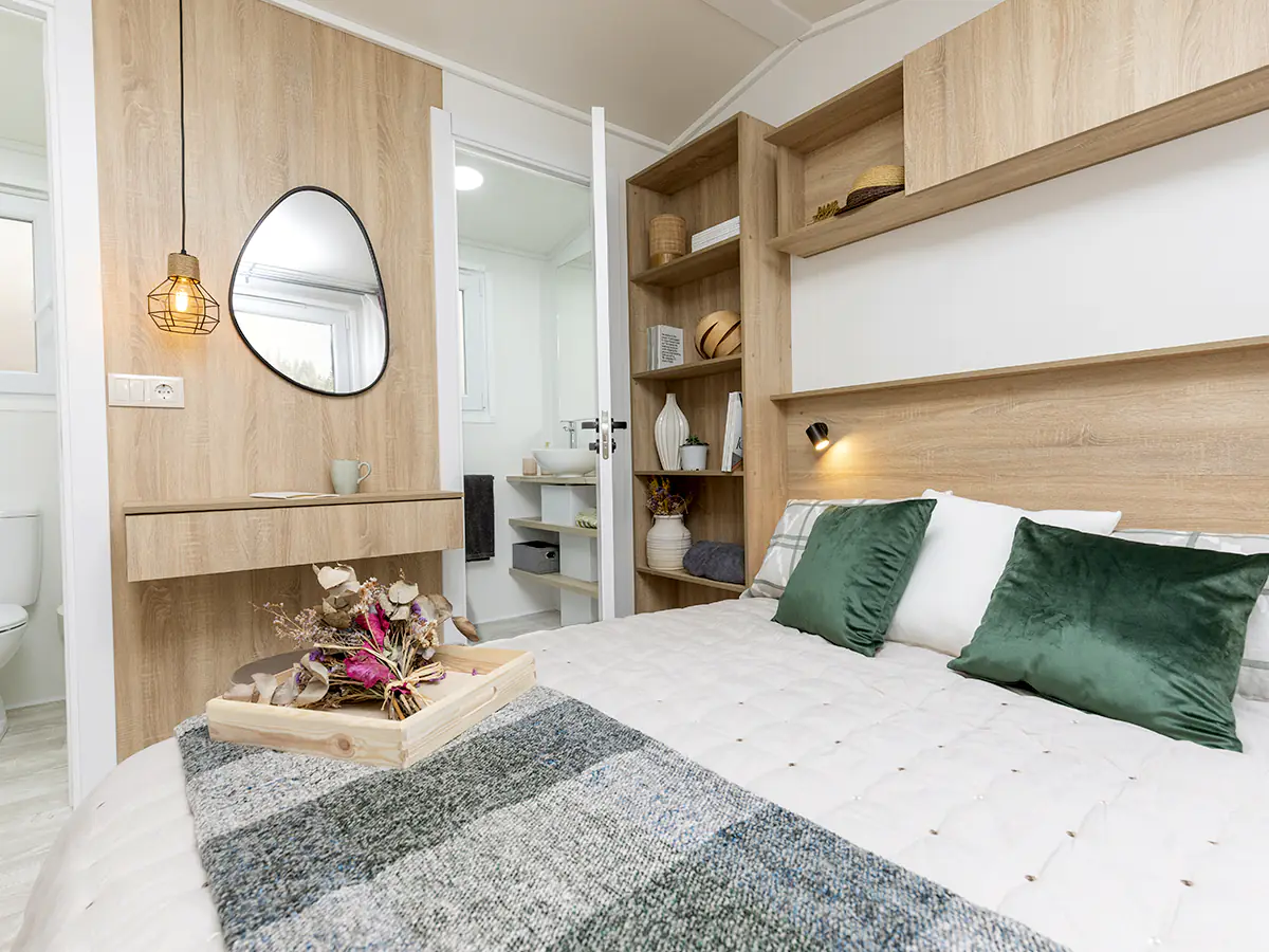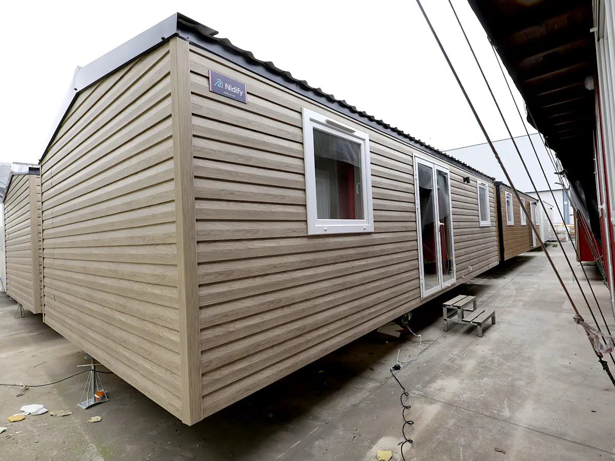 Mobil home nuevo en exposición de la Serie E de NIDIFY. Acabado exterior en Vinilo Natural.