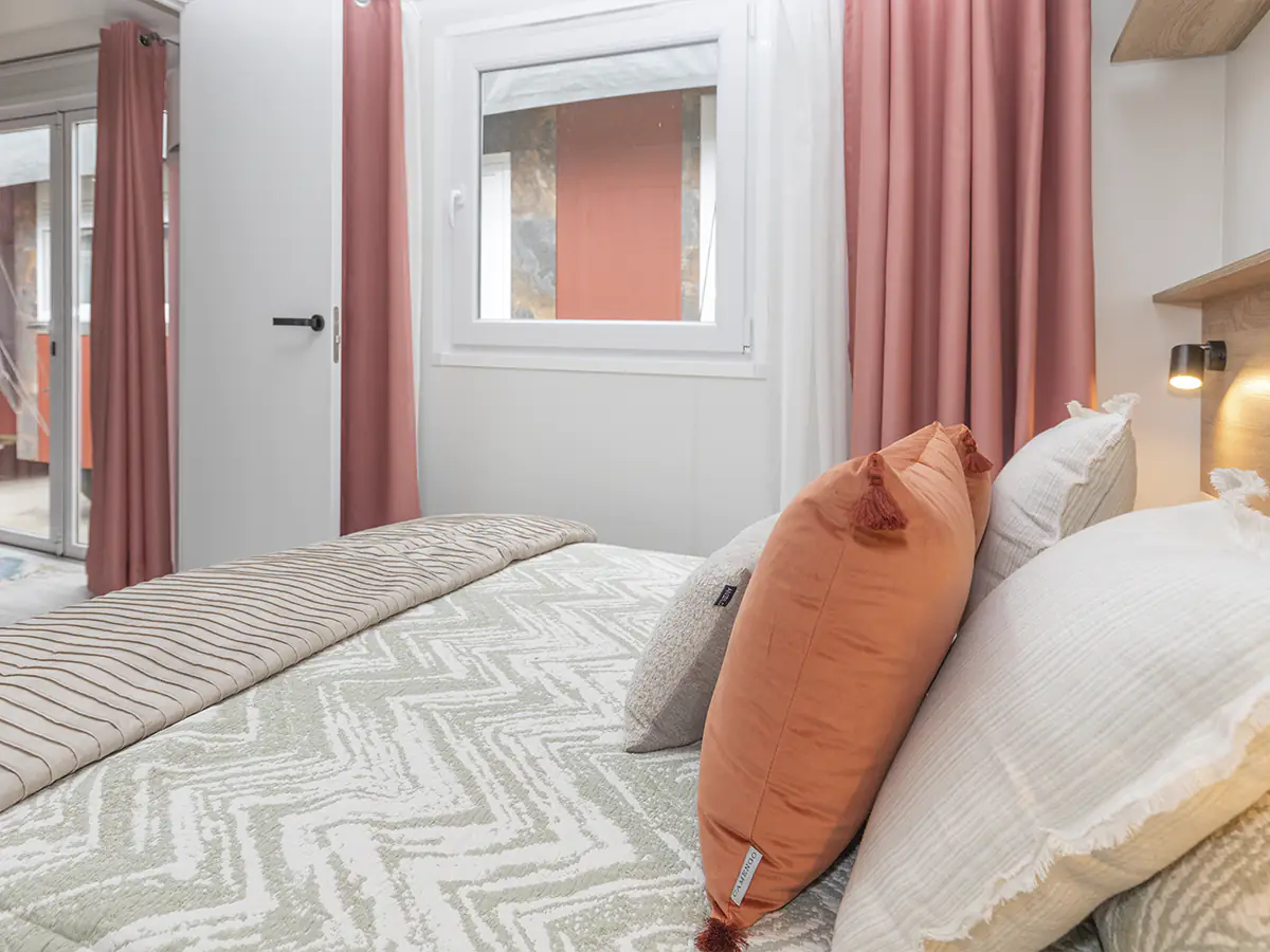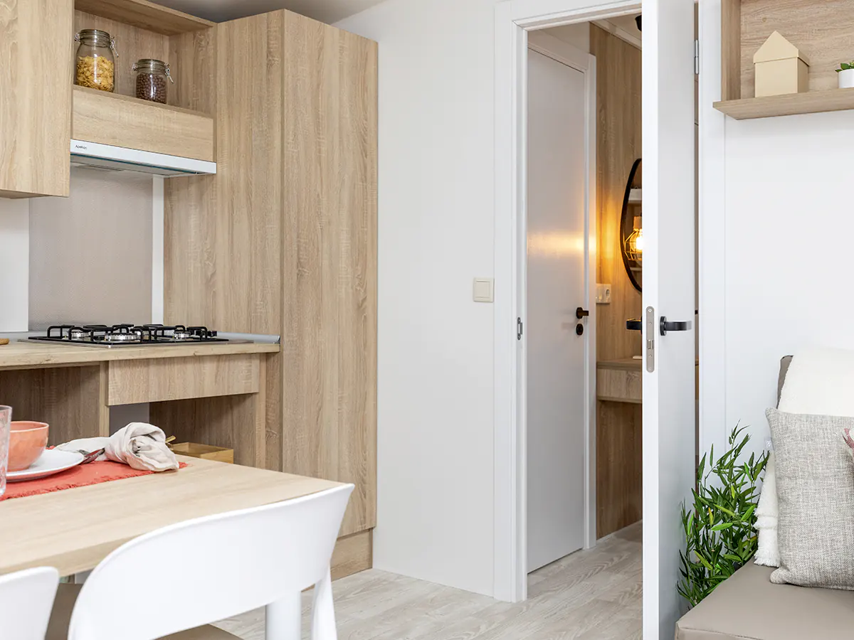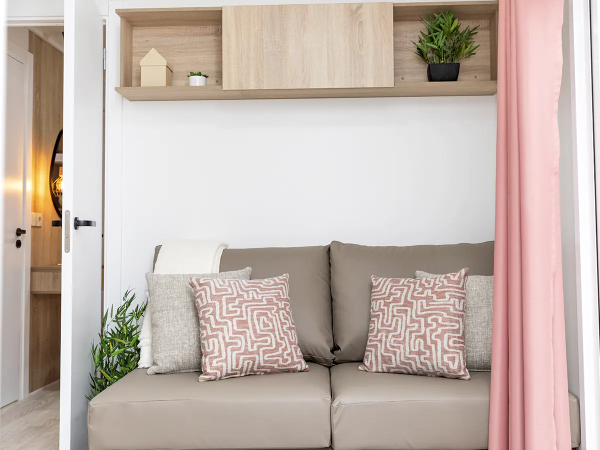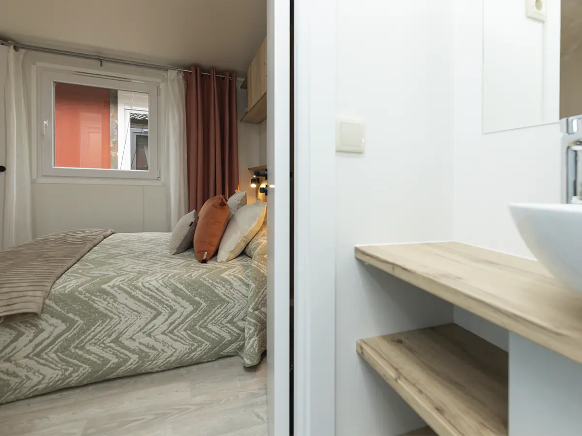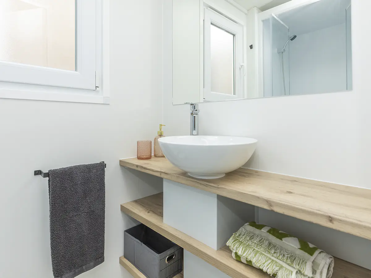 Mobil home nuevo en exposición de la Serie E de NIDIFY. Acabado exterior en Vinilo Natural.